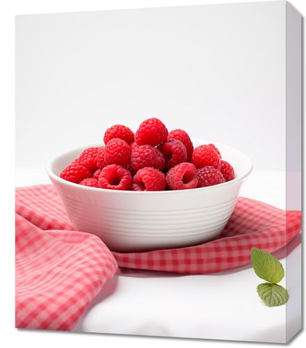 Obraz z serii wnętrza zatytułowany Lato w Misce. Na obrazie widnieje pełna misa soczystych, dojrzałych malin, które kontrastują swoją intensywną czerwienią z czystą bielą naczynia i tłem. Rozłożona obok misy czerwono-biała, kratka serwetka dodaje wiejskiego uroku, a pojedynczy listek mięty wprowadza świeży akcent. Ten obraz przyciąga wzrok swoją prostotą i elegancją, idealnie uchwycając esencję letniego sezonu i świeżości owoców. Doskonały do ożywienia kuchni, jadalni, a także jako element dekoracyjny w przestrzeniach, gdzie chce się wprowadzić nutę świeżości i naturalnego piękna. Zaprasza do celebracji zdrowego stylu życia i radości płynącej z prostych przyjemności.