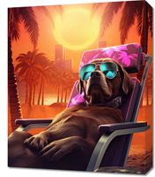 Obraz z serii pop art zatytułowany Lato w Stylu. Na tej zabawnej ilustracji widzimy psa rasy labrador, wygodnie ułożonego na leżaku plażowym, w okularach przeciwsłonecznych, z tłem zachodzącego słońca i palm. Jego relaksująca poza i luźny styl, w połączeniu z żywymi kolorami tropikalnego wschodu lub zachodu słońca, oddają atmosferę beztroskich wakacji. Obraz ten jest idealnym wyborem dla miłośników psów i letnich klimatów, świetnie nadaje się do dekoracji ścian w domach, hotelach nad morzem, czy jako dodatek do letnich barów i restauracji, wprowadzając element humoru i wakacyjnego luzu.