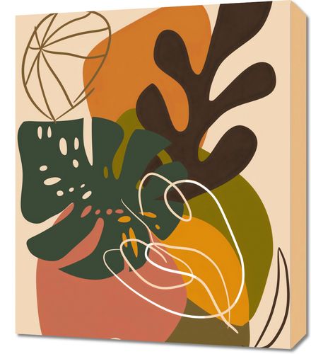 Obraz z serii minimalistyczne zatytułowany Leśna Kompozycja. Na tej grafice przedstawione są uproszczone, ale wyraźne kształty liści i roślin leśnych, które łączą się tworząc ciepłą i kojącą kompozycję. Barwy jesienne, od głębokiej zieleni, przez ciepły pomarańcz, aż po bogate brązy, są połączone z delikatnymi liniami, które przypominają światło przebijające się przez drzewa.Ten obraz będzie pięknym uzupełnieniem wnętrz, w których dominuje natura i spokój, takich jak skandynawskie lub rustykalne salony, przestrzenne holu czy jasne sypialnie. Wyraźne formy i ciepłe barwy wprowadzą harmonię i przyjemną dla oka różnorodność do każdego pomieszczenia.