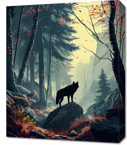 Obraz z serii natura zatytułowany Leśne Echa. Ilustracja przedstawia samotnego wilka stojącego na skale, który wpatruje się w mglistą dal tajemniczego lasu. Złote światło przebijające się przez drzewa nadaje scenie spokojną, ale zarazem majestatyczną atmosferę. Jesienne liście w odcieniach czerwieni kontrastują z chłodnymi tonami otoczenia, podkreślając zmienność sezonów. Obraz ten oddaje uczucie zadumy i połączenia z naturą, będąc idealnym dodatkiem do wnętrz, które cenią sobie spokój i dziką przyrodę, takich jak górskie chaty, saloniki z kominkiem lub przestrzenie wypoczynkowe.