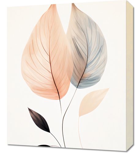 Obraz z serii wnętrza zatytułowany Liściasty Taniec. Subtelne krzywe i delikatne niuanse kolorów liści przechodzących od pastelowego różu do głębokiego szaro-niebieskiego, tworząc efekt wizualnej symfonii. Delikatność i precyzja linii liści, jak i kontrastujący ciemny liść u podstawy, dodają kompozycji elegancji i głębi. Przemyślane połączenie kolorów i kształtów emanuje spokojem i równowagą, przypominając o pięknie i prostocie natury. Idealnie wpasuje się w nowoczesne spa, minimalistyczne sypialnie oraz w przestrzeniach relaksacyjnych, gdzie dominują naturalne elementy dekoracyjne.