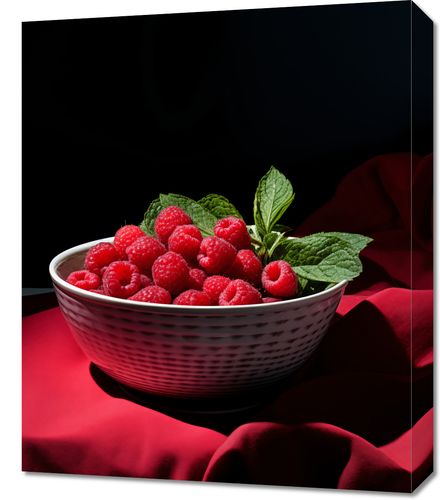 Obraz z serii wnętrza zatytułowany Malinowa Misa. Na tej wyrazistej kompozycji widnieje biała misa pełna świeżych, soczystych malin ułożonych na intensywnie czerwonej tkaninie, co tworzy zmysłowy kontrast kolorystyczny. Delikatne światło akcentujące fakturę i blask malin oraz dodatek zielonych liści mięty dodają świeżości i naturalnego piękna do sceny. Ten obraz z pewnością przyciągnie wzrok w każdej przestrzeni, od nowoczesnych kuchni po eleganckie jadalnie, a także stanowić będzie wyjątkowy element dekoracyjny w restauracjach i kawiarniach. Symbolizuje on radość z degustacji i estetyczną przyjemność, jaką dają proste, ale wyrafinowane smaki.