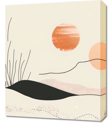 Obraz z serii boho zatytułowany Miękkie Wzgórze. Przedstawia on poetycką interpretację zachodzącego słońca, gdzie delikatne linie roślin wyłaniają się z miękkich, falujących wzgórz. Paleta kolorów to ciepłe odcienie beżu, różu oraz akcenty silniejszego pomarańczu i głębokiej czerni, które razem tworzą kojącą i spokojną atmosferę. Abstrakcyjne słońca o różnych odcieniach i wielkościach dodają kompozycji głębi i perspektywy. Ten obraz doskonale sprawdzi się jako akcent dekoracyjny w przestrzeniach, które mają być miejscem relaksu i odprężenia. Jego spokojna kolorystyka i delikatne linie będą komplementować wnętrza takie jak sypialnie, pokoje medytacyjne, gabinety relaksacyjne lub każde miejsce, które chce celebrować spokój i cichą elegancję.