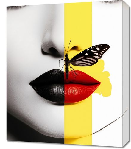 Obraz z serii abstrakcja zatytułowany Motyla Piękność. Ten obraz przedstawia twarz kobiety podzieloną na dwa kontrastujące segmenty: jeden w czerni i bieli, drugi w żywych kolorach z motylem na ustach. Ilustracja eksploruje temat dualizmu natury ludzkiej, piękna i jego zmienności. Obraz ten jest idealnym wyborem dla przestrzeni o współczesnym designie, takich jak salony piękności, studia artystyczne, a także jako wyrazisty element dekoracyjny w nowoczesnych domach.