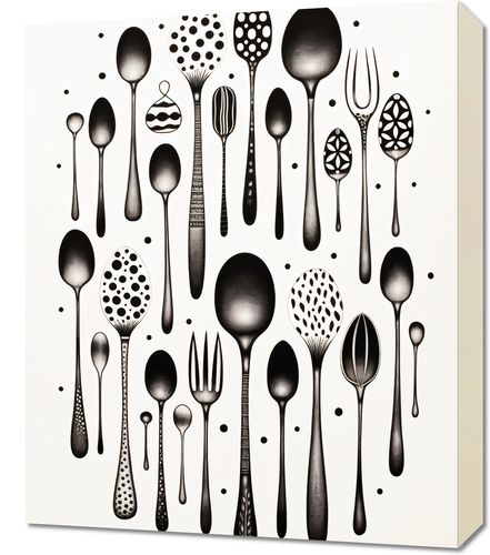 Obraz z serii wnętrza zatytułowany Narzędzia Smaku. Eleganckie sylwetki sztućców w różnorodnych kształtach i wzorach, podkreślane przez subtelne detale i geometryczne punkty, tworzą harmonijną i równocześnie zaskakującą kompozycję. Czarne i białe tony nadają prostotę i wyrafinowanie, podczas gdy unikalne projekty sztućców dodają nuty kreatywności i innowacji. Idealnie sprawdzi się w nowoczesnych kuchniach, restauracjach o minimalistycznym designie oraz w przestrzeniach dedykowanych sztuce kulinarnej.