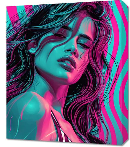 Obraz z serii pop art zatytułowany Neonowy Wzrok. Przedstawia on postać kobiety w stylu neonowej fantazji, z jej włosami i konturami twarzy podświetlonymi żywymi barwami cyjanu i różu na tle hipnotyzujących, pulsujących linii. Dynamiczna kompozycja i odważne kolory odzwierciedlają witalność i energię, jednocześnie wprowadzając element futurystycznego stylu. Ten obraz jest doskonałym uzupełnieniem nowoczesnego wnętrza, które chce wprowadzić mocny, wizualny akcent, idealny do miejskich loftów, salonów mody lub awangardowych przestrzeni galerii.