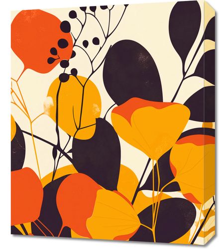 Obraz z serii minimalistyczne zatytułowany Ogrodowa Paleta. Na tej grafice dominują roślinne motywy z wyraźnymi konturami na tle pastelowych barw. Intensywne odcienie czerwieni, pomarańczy i żółci przeplatają się z głębokimi czerniami i złocistymi akcentami, tworząc bogaty, lecz harmonijny obraz.Ten obraz znajdzie swoje miejsce w przestrzeniach, gdzie kolor i życie są celebrowane. Z powodzeniem ozdobi ściany kreatywnych biur, eklektycznych salonów czy przytulnych zakątków domu. Jego energetyzujące barwy wniosą ciepło i radość do każdego wnętrza, jednocześnie będąc odważnym akcentem w bardziej stonowanych dekoracjach.