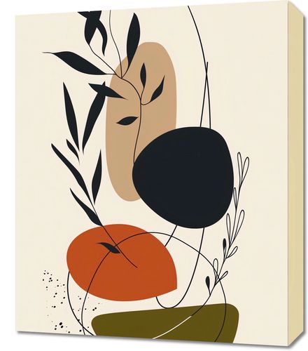 Obraz z serii minimalistyczne zatytułowany Orszak Natury. Kompozycja ta wyraża subtelny urok abstrakcji, przywołując na myśl symbiozę sztuki i natury. Użycie ograniczonej palety kolorystycznej, obejmującej zielenie, czerwienie, czernie i beże, dodaje pracę ciepła i naturalności, a zarazem utrzymuje jej prostą elegancję. Linie są zarówno płynne, jak i geometryczne, co tworzy interesujące przeciwstawienie i zachęca do refleksji nad formami w naturze. Owa grafika może wnieść spokój i równowagę wizualną do każdej przestrzeni, będąc zarówno delikatnym uzupełnieniem, jak i głównym punktem zainteresowania.