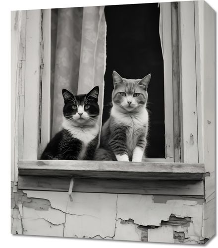 Obraz z serii wnętrza zatytułowany Para w Oknie. Uchwycenie momentu, w którym dwa koty o spokojnych i pełnych godności spojrzeniach pozują w oknie zaniedbanej fasady. Czarno-białe tło fotografii dodatkowo wzmacnia ich wyraziste, charakterystyczne wzory na sierści. Ten obraz to nie tylko urokliwa scena z życia miejskich kotów, ale również piękna metafora o spokoju i zgodzie, jaką można odnaleźć w najprostszych momentach codzienności. Obraz ten będzie wyjątkowym dodatkiem do każdego wnętrza, szczególnie polecany dla miłośników zwierząt i estetyki vintage, a także jako element ozdobny w kawiarniach czy księgarniach, który wnosi element ciepła i domowego klimatu.