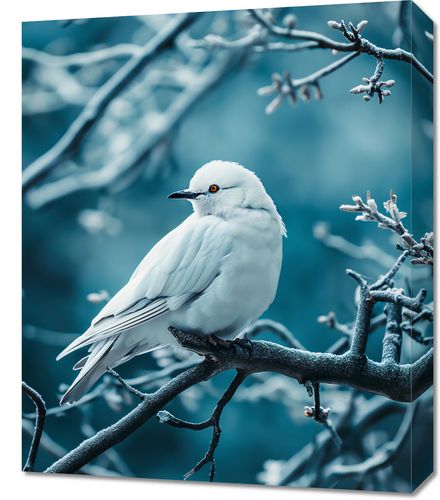Obraz z serii natura zatytułowany Perłowy Ptak przedstawia urokliwy obraz białego ptaka, który spoczywa na gałęzi drzewa. Ptak, o perłowo białym upierzeniu i przejmujących pomarańczowych oczach, wydaje się być wyizolowany od świata, znajdując ukojenie w zimowej aurze. Tło w chłodnych, niebieskich tonacjach kontrastuje z ciepłym akcentem koloru oczu ptaka, tworząc atmosferę harmonii i spokoju. Delikatne szrony na gałęziach dodają obrazowi delikatności i subtelności, zaś skomponowany w minimalistycznej estetyce, ten plakat jest idealny do wnętrz, które cenią sobie spokój, elegancję oraz kontakt z naturą. Doskonale wpasuje się w przestrzenie takie jak salony relaksacyjne, gabinety terapeutyczne czy nawet jako ukojenie dla oczu w dynamicznie zmieniających się współczesnych biurach.