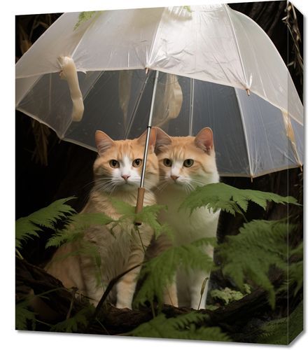 Obraz z serii wnętrza zatytułowany Podwójna Ochrona przedstawia dwie urocze, rude koty szukające schronienia pod przezroczystym parasolem, który zdaje się być koroną zielonej paproci. Ich symetryczne odbicie w połyskliwej strukturze parasola dodaje głębi i charakteru kompozycji. Ciepłe odcienie futra kotów kontrastują z ciemnym, zielonym tłem, co sprawia, że stają się centralnym punktem obrazu. Ich spojrzenia są skierowane prosto w obiektyw, co nadaje fotografii osobisty i intymny charakter. To zdjęcie idealnie uchwyciło moment spokoju i ochrony w naturalnym otoczeniu, a zarazem subtelnie podkreśla więź między dwoma zwierzętami. Idealne do wnętrz o domowym, ciepłym charakterze, zarówno dla miłośników kotów, jak i miłośników przyrody.