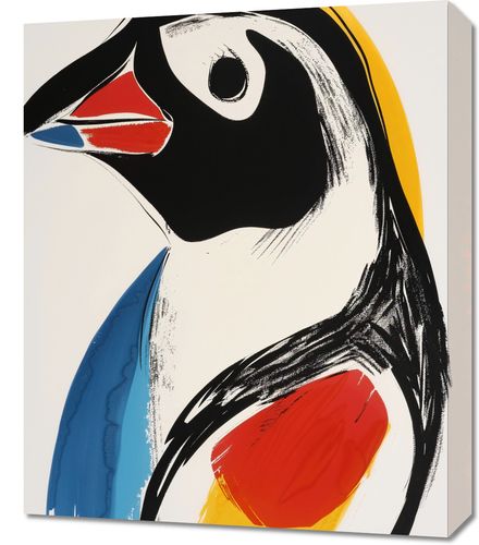 Obraz z serii abstrakcja zatytułowany Portret Ptaka. Prezentuje on stylizowany obraz ptaka, być może maskonura, z charakterystycznym dużym okiem i kolorowym dziobem. Artysta użył odważnych, geometrycznych kształtów i intensywnych barw, aby uchwycić esencję ptaka w prosty, ale wpadający w oko sposób. Duże bloki czerni, błękitu, czerwieni i żółci są zastosowane z lekkością pociągnięć pędzla, co nadaje dziełu lekkości i dynamiki. Ten obraz jest świadectwem tego, jak minimalizm może w pełni wyrazić piękno natury, będąc jednocześnie współczesnym i śmiałym elementem w każdym wnętrzu, od domowych przestrzeni po nowoczesne biura.