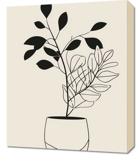 Obraz z serii minimalistyczne zatytułowany Prostota Doniczki. Obraz przedstawia elegancką kompozycję roślin w doniczce, narysowanych za pomocą czystych, prostych linii. Kontrastowe czarne liście na górze są zrównoważone przez delikatny zarys krzewu poniżej. Prosta doniczka o zaokrąglonych kształtach dodaje kompozycji nowoczesnego charakteru.Dzieło to wnoszące do wnętrza powiew świeżości i natury, jest idealnym wyborem dla przestrzeni, które cenią sobie spokój i czyste linie. Doskonale nadaje się do minimalizmu, skandynawskiego stylu mieszkania, biur, czy pokoi o jasnym wystroju, gdzie sztuka ma za zadanie uspokajać i przynosić harmonię.