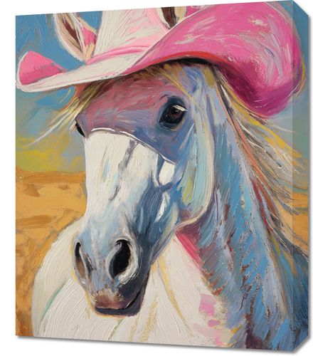 Obraz z serii pop art zatytułowany Różowy Kapelusz to barwna i pełna życia ilustracja przedstawiająca portret konia w różowym kapeluszu kowbojskim. Wyraźne, dynamiczne pociągnięcia pędzla i bogata paleta barw nadają obrazowi wrażenie ruchu i żywiołowości. Tło w ciepłych odcieniach żółci i błękitu podkreśla sylwetkę konia, a różowy kapelusz dodaje humorystyczny, ale i elegancki akcent kompozycji. Obraz ten idealnie nadawałby się do dekoracji wnętrz z charakterem, takich jak westernowe bary, restauracje z amerykańską tematyką, pokoje młodzieżowe czy inne przestrzenie, które chcą wprowadzić element zabawy i niekonwencjonalności.