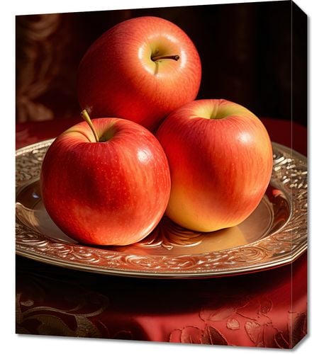 Obraz z serii natura zatytułowany Rubinowe Ekscesy. Trzy soczyste jabłka o lśniącej rubinowej skórce, delikatnie ułożone na antycznym srebrnym talerzu o bogato zdobionych brzegach. Każde jabłko jest uchwycone w pełni swojego naturalnego piękna, z delikatnymi refleksami światła podkreślającymi ich świeżość i kuszący wygląd. Tło z głębokim czerwonym brokatem, dodaje głębi i luksusu kompozycji. Obraz idealnie komponuje się w przestrzeniach kulinarnych, takich jak restauracje wysokiej klasy czy domowe kuchnie, gdzie podkreśla znaczenie estetyki w prezentacji potraw.
