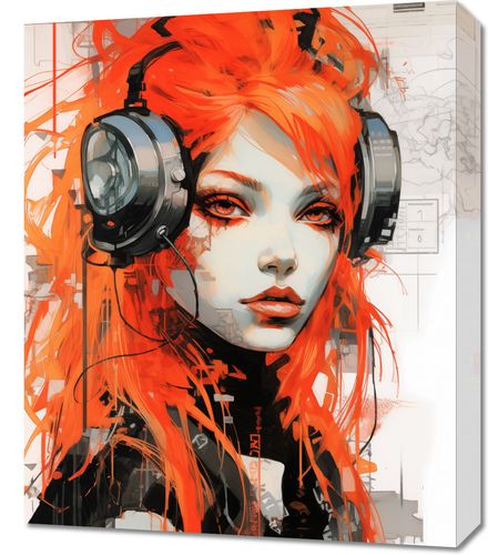Obraz z serii pop art zatytułowany Rytm Metropolii. Dynamiczna kompozycja łączy portret kobiety o wyrazistych, pomarańczowych włosach z elementami miejskiego krajobrazu. Jej spojrzenie jest intensywne i pełne pasji, zaś duże słuchawki na uszach sugerują miłość do muzyki i rytmu wielkiego miasta. Abstrakcyjne linie i kształty, mieszające się z realistycznie oddaną postacią, tworzą wrażenie ruchu i pulsującej energii. To dzieło sztuki jest idealne dla miłośników muzyki, street artu i nowoczesnego designu, doskonale nadając się do wnętrz loftów, studiów muzycznych czy awangardowych salonów, które pragną podkreślić miejski charakter swojej przestrzeni.