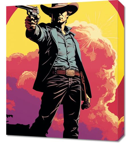 Obraz z serii pop art zatytułowany Strzelec z Epoki. Ten obraz przedstawia postać klasycznego kowboja w akcie wystrzału, z tłem wschodzącego słońca, które rozświetla scenę w ciepłych odcieniach czerwieni i pomarańczy. Silny kontrast i zdecydowane linie wydobywają charakterystyczne cechy postaci, od kapelusza po detale na szelkach i pasie. Obraz ten jest hołdem dla kultury westernów i bezkresnych amerykańskich przestrzeni, idealny dla miłośników historii i kinematografii, a także jako wyrazisty element dekoracyjny w miejscach takich jak domy, bary tematyczne lub sale kinowe.