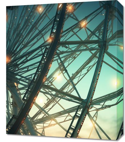 Obraz z serii wnętrza zatytułowany Światła Molocha. Na tym zachwycającym zdjęciu wielka konstrukcja diabelskiego młyna jest uchwycona z nietypowej perspektywy, ukazując skomplikowaną sieć metalowych prętów oświetlonych setkami migoczących światełek. Złoty zachód słońca w tle nadaje scenie ciepły, oniryczny nastrój. Ten obraz to pochwała inżynierskiego geniuszu i miejskiego życia, idealnie komponujący się w nowoczesnych przestrzeniach, takich jak biura, lofty, a także w przestrzeniach publicznych czy domowych salonach. Jest to również doskonała inspiracja dla tych, którzy cenią sobie miejską estetykę i nowoczesny design.