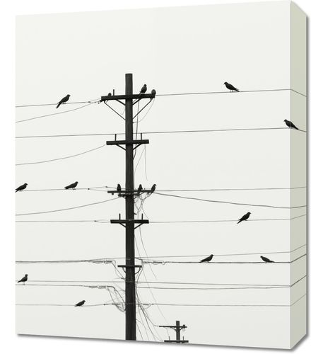 Obraz z serii pejzaże zatytułowany Symfonia na Drutach. Prezentuje on prostotę miejskiego krajobrazu, gdzie ptaki siedzą równomiernie rozmieszczone na przewodach telefonicznych. Czyste tło i sylwetki ptaków na linii energetycznej tworzą graficzny i rytmiczny wzór, który jest zarówno spokojny, jak i dynamiczny. Ten obraz to hołd dla nieoczekiwanej urody w codziennych scenach miejskich, idealny dla tych, którzy cenią sobie prostotę i nowoczesny design. Pasuje do nowoczesnych wnętrz biurowych, minimalistycznych salonów oraz wszędzie tam, gdzie sztuka ma za zadanie wprowadzać element spokoju i porządku.