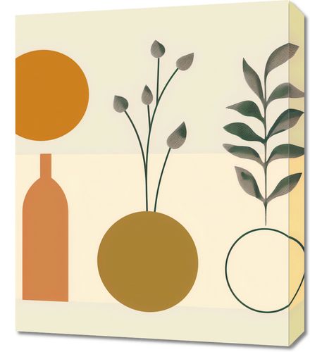 Obraz z serii boho zatytułowany Symfonia Równowagi. Obraz łączy organiczne kształty roślin z rygorystyczną formą geometrii. Prezentuje on wazony w spokojnych odcieniach brązu i złota, z których jeden jest ozdobiony gałązkami z delikatnymi pąkami, a drugi pokazuje symetryczny wzór liści. Proste linie i figury geometryczne, takie jak okrąg i prostokąt, tworzą tło dla roślinności, przypominając o ludzkiej próbie ujarzmienia natury. Całość osadzona na pastelowym tle wywołuje uczucie spokoju i harmonii. To dzieło będzie pasowało do przestrzeni, które cenią równowagę między naturą a stworzonym przez człowieka porządkiem, jak eleganckie gabinety, przestrzenie wellness lub strefy odpoczynku, które dążą do stworzenia oazy spokoju w zabieganym świecie.