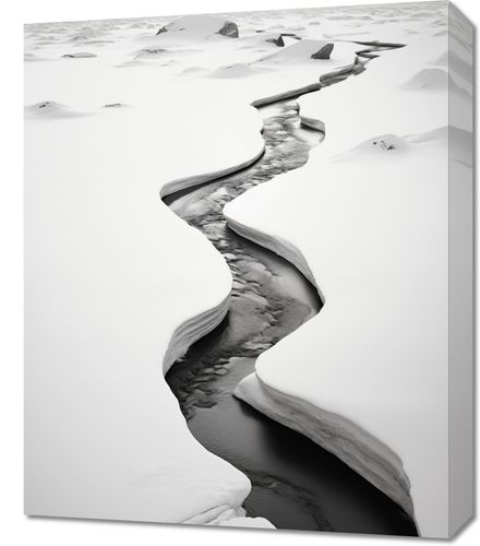 Obraz z kolekcji pejzaże zatytułowany Meandry Mrozu. Ten obraz przedstawia sinący lodowiec, którego szczeliny przecinają śnieżnobiałą powierzchnię, tworząc naturalne dzieło sztuki. Monochromatyczna paleta barw, gdzie biel śniegu kontrastuje z głębokim czerniami wód lodowcowych, przemawia do wyobraźni i wywołuje uczucie surowości oraz majestatu natury. Doskonały do wnętrz o minimalistycznym designie lub jako mocny wizualny akcent w przestrzeniach takich jak salony, biura i lobby hotelowe, gdzie może inspirować do refleksji nad pięknem i siłą przyrody.