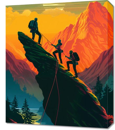 Obraz z serii abstrakcja zatytułowany U Szczytu przedstawia grupę wędrowców wspólnie zdobywających szczyt górski przy zachodzie słońca. Scena jest nasączona żywymi odcieniami pomarańczy i czerwieni, które tworzą dramatyczny, ale piękny kontrast z ciemnozielonymi drzewami i skalistym terenem. Sylwetki wędrowców są w centrum kompozycji, wyraźnie zarysowane przeciwko tłu światła słonecznego, co podkreśla ich osiągnięcie i trud włożony w zdobycie szczytu. Przepiękny zachód słońca z dużym, jasnym słońcem na horyzoncie nadaje całej scenie uczucie spokoju i spełnienia. Obraz ten oddaje ducha przygody i piękno natury, idealny dla miłośników gór i tych, którzy cenią siłę ludzkiego ducha. Doskonały do dekoracji ścian w domach, schroniskach górskich lub jako inspiracja w przestrzeniach, gdzie docenia się przyrodę i aktywny tryb życia.