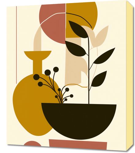 Obraz z serii minimalistyczne zatytułowany Wielkość Natury. Zaprezentowana jest tutaj elegancka kompozycja roślin w prostym naczyniu, zestawiona z geometrycznymi blokami kolorów w ciepłej, naturalnej palecie. Przywodzi ona na myśl harmonię i zorganizowaną prostotę, które można znaleźć w naturze, jak również w ludzkich tworach. Elementy w kształcie koła i półkola nadają kompozycji spokoju i równowagi, a linie i bloki kolorów tworzą poczucie głębi i struktury. Ten obraz będzie idealny do wnętrz, gdzie ceni się porządek i minimalistyczne podejście do dekoracji, wnosząc jednocześnie elementy natury i spokoju. Idealny do umieszczenia w przestrzeniach takich jak nowoczesne salony, eleganckie gabinety, lub jako spokojne tło w przestrzeniach biurowych.