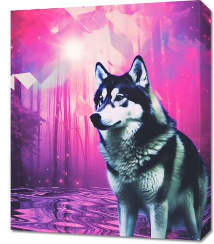 Obraz z serii pop art zatytułowany Wilczy Duch. Ta hipnotyzująca grafika łączy w sobie realistyczny wizerunek wilka z eterycznym, neonowym lasem w tle, co nadaje scenie onirycznego, mistycznego charakteru. Wilk, przedstawiony w pełnym majestacie, stoi na brzegu zaczarowanego jeziora, a tajemnicze, geometryczne kształty unoszą się w powietrzu, dodając kompozycji elementu fantastyki. Wyraziste kolory różu i fioletu tworzą niemal bajkową atmosferę. Obraz jest idealnym wyborem dla miłośników natury i jej mistycznych aspektów, świetnie nadaje się do wnętrz o tematyce przyrodniczej, pokojów dla młodzieży, lub jako unikatowy element dekoracyjny w przestrzeniach współczesnych.