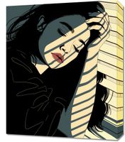 Obraz z serii abstrakcja zatytułowany Zamysł. Obraz przedstawia kobietę z zamyślonym wyrazem twarzy, z głową opartą na dłoni, co sugeruje moment introspekcji lub smutku. Silne cienie i linie świetlne tworzące prążki na jej twarzy dodają głębi kompozycji, a kontrastująca paleta kolorów z dominującymi odcieniami niebieskiego i czerni, podkreślona akcentem czerwieni ust, potęguje emocjonalne napięcie dzieła. Ten obraz może symbolizować skomplikowane emocje ludzkiego doświadczenia i jest idealnym dodatkiem do przestrzeni, które cenią sobie głębię i wyrazistość w sztuce, takich jak salon, studio twórcze, czy miejsce do medytacji.