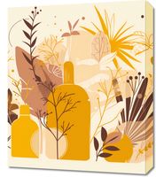Obraz z serii minimalistyczne zatytułowany Złote Rośliny. Na tym jasnym i przyjemnym dla oka dziele sztuki widzimy kolekcję roślin i butelek w ciepłej, jesiennej palecie kolorów, od jasnych beżów po złociste żółcie i głębokie brązy, tworząc zrelaksowaną atmosferę. Ten obraz doskonale uzupełni wnętrza inspirowane naturą i organicznymi formami. Byłby idealny do salonów, które wykorzystują naturalne światło do wzmocnienia wizualnego ciepła, a także do przestrzeni wellness i spa, gdzie stworzyłby atmosferę spokoju i ukojenia.