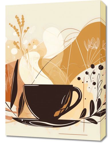Obraz z serii minimalistyczne zatytułowany Aromatyczna Przerwa. Grafika ta przedstawia sylwetkę ciemnego kubka kawy, który jest otoczony przez abstrakcyjne kwiatowe motywy i organiczne kształty w ciepłych odcieniach karmelu, brązu i beżu, przypominających bogactwo i głębię smaków kawy. Przezroczyste i subtelne linie dodają lekkości i wyrafinowania całej kompozycji.Ten obraz świetnie odnajdzie się w wnętrzach, gdzie chwile relaksu i odpoczynku są cenione. Doskonale nadaje się do przytulnej kawiarni, jadalni, czy nawet domowej kuchni, gdzie może przypominać o przyjemności płynącej z przerwy na kawę.