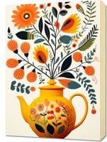 Obraz z serii wnętrza zatytułowany Bujna Herbata. Zachwycające, soczyste barwy kwiatów i liści wyrastających z eleganckiego żółtego dzbanka do herbaty, na którym uwagę przyciągają malowane motywy roślinne. Wzory i kolory wspaniale harmonizują ze sobą, tworząc kompozycję pełną życia i radości. Delikatne linie i estetyczny układ sprawiają, że prace ożywiają każdą przestrzeń. Świetnie sprawdzi się w kawiarniach, herbaciarniach jak i również w domowych jadalniach czy salonach.