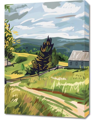 Obraz z serii pejzaże zatytułowany Bujna Wieś. Plakat przedstawia malowniczą scenę z wiejskiego krajobrazu, gdzie dominuje pastelowa paleta barw. W centralnym punkcie obrazu widzimy prostą, białą chłopską chatę z szarym dachem, otoczoną przez bujną, zieloną roślinność i rozległe pola. Drzewa z żółtymi akcentami wskazują na wczesną jesień, a ich rozmieszczenie i forma dają wrażenie naturalnego, rustykalnego otoczenia. Jasne, dynamiczne pociągnięcia pędzlem na niebie nadają scenie lekkości i ruchu, podczas gdy delikatnie zaznaczone wzgórza w tle oferują poczucie głębi i przestrzeni. Kolorystyka obrazu, łącząca ciepłe odcienie żółci z chłodnymi błękitami, przyciąga oko i sprawia, że scena jest zarówno spokojna, jak i energetyczna. Ta ilustracja może przywoływać uczucia nostalgii i spokoju, a także zachęcać do refleksji nad pięknem prostego życia na wsi.