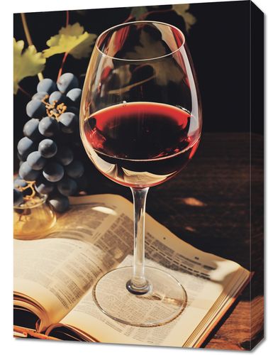 Obraz z serii wnętrza zatytułowany Bukiet Historii. Na tej zachęcającej ilustracji widzimy kieliszek czerwonego wina delikatnie spoczywający na otwartej stronie książki, z wyraźnym odbiciem na stronach. Obok kieliszka umieszczono grono dojrzałych winogron, a całość kompozycji znajduje się na ciemnym tle, co podkreśla bogactwo i głębię barw. Ten obraz oddaje przyjemność płynącą z połączenia relaksującej lektury z degustacją wybornego wina, idealny dla miłośników dobrych książek i enologii, świetnie sprawdzi się w domowych biblioteczkach, salonach degustacyjnych czy jako wyrafinowana dekoracja w winiarniach.