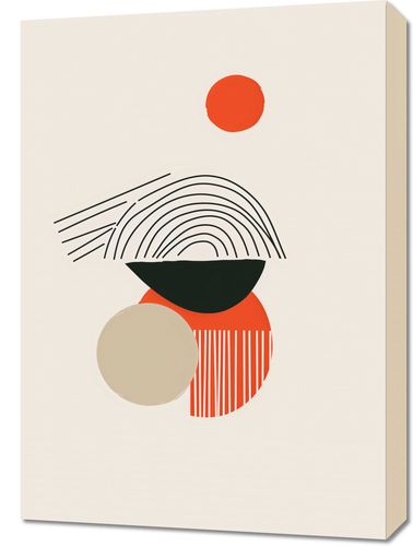 Obraz z serii boho zatytułowany Centralne Słońce to dzieło artystyczne utrzymane w stonowanej palecie kolorystycznej, na którym dominują geometryczne kształty i linie. Na górnej części kompozycji widnieje małe, jaskrawe czerwone koło, które może symbolizować słońce lub inny punkt centralny. Poniżej znajduje się czarna, półokrągła forma z koncentrycznymi liniami, przypominającymi ułożenie naturalnych warstw kamienia lub drzewa. Tuż obok, kontrastujące z nią, znajduje się większe, jasno beżowe koło, które wraz z czarnym półkolem tworzy iluzję przestrzeni. Na dole obrazu uwagę przyciąga większe, okrągłe pole w odcieniu ciepłego pomarańczu, na którym znajduje się wzór pasków w kierunku pionowym, dodający tekstury i ruchu. Całość utrzymana jest w estetyce minimalizmu i modernizmu, gdzie każdy element, choć prosty, jest starannie wyważony, by współgrać z resztą kompozycji.