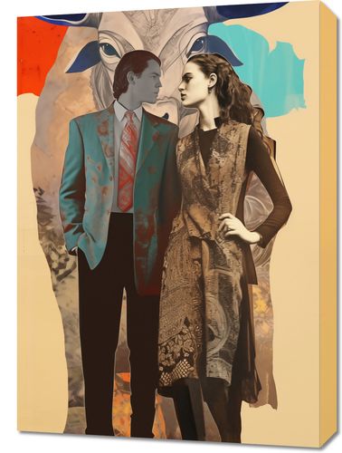 Obraz z serii abstrakcja zatytułowany Dialog Kultur. Ten unikalny obraz przedstawia mężczyznę i kobietę w tradycyjnych strojach, stojących na tle abstrakcyjnego wizerunku byka, który może symbolizować siłę i dziedzictwo kulturalne. Ich ubiory, pełne tekstur i wzorów, w połączeniu z modernistycznym tłem, odzwierciedlają zetknięcie się różnych epok i wartości. Obraz wyraża ideę harmonii pomimo różnorodności, łącząc w sobie elementy historyczne z nowoczesną abstrakcją. Jest to doskonały wybór dla przestrzeni celebrujących różnorodność i bogactwo kulturowe.