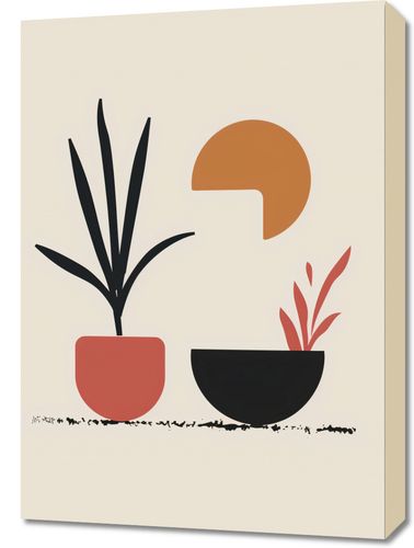 Obraz z serii boho zatytułowany Domowy Ogród. Obraz łączy proste, geometryczne formy roślin z ciepłą kolorystyką, tworząc przytulny obraz domowego ogrodu. Czerwony i czarny wazon z roślinnością wyrastają nad delikatną linia ziemi, przywołując obrazy spokojnego wnętrza. Niedokończony półksiężyc w kolorze pomarańczowym dodaje kompozycji delikatności i podkreśla domową atmosferę. Dzieło doskonale nadaje się do miejsca, które ma być oazą spokoju i relaksu, takiego jak sypialnia lub cichy kącik do czytania. Jego proste i spokojne kolory mogą również przynieść harmonię do miejsca pracy lub studiowania, promując skupienie i spokój.