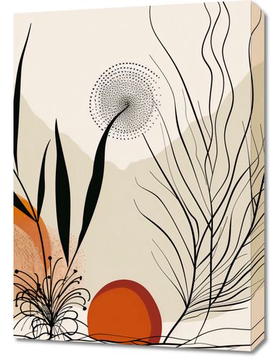 Obraz z serii minimalistyczne zatytułowany Echem przez Pustynie. Obraz przedstawia abstrakcyjny, pustynny pejzaż, gdzie organiczne kształty roślin łączą się z geometrycznymi formami słonecznych dysków. Ciemne, dynamiczne linie roślin przecinają pastelowe tło w kolorach beżu i brązu, tworząc kontrastowe ale harmonijne połączenie. Rozproszone kropki na jednym z elementów wyglądają jak drobinki piasku unoszące się w powietrzu lub delikatne nasiona rośliny gotowe do rozsiania przez wiatr. Ten obraz emanuje ciepłem i naturalnością, doskonale wpisując się w przestrzenie, które cenią sobie spokój, minimalizm i bliskość z naturą. Idealnie sprawdzi się w salonach, poczekalniach, czy jasnych korytarzach, dodając im subtelnej elegancji i organicznego charakteru.