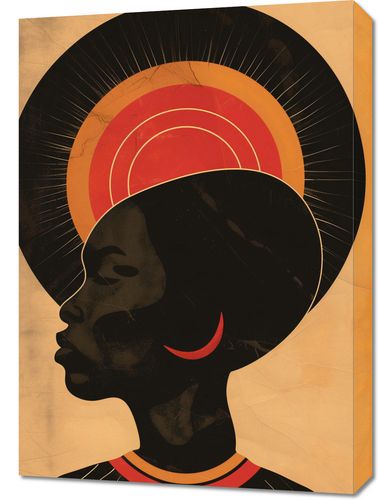 Obraz z serii abstrakcja zatytułowany Gorące Promienie to urzekający portret profilu kobiety, który wyraża siłę i spokojną godność. Jej sylwetka jest wyraźna i zdecydowana, z podkreślonymi, mocnymi liniami, a tło za jej głową tworzy aureolę w ciepłych odcieniach, od ciemnego poprzez jaskrawe odcienie pomarańczu do złota, co może symbolizować wschód lub zachód słońca. Te koncentryczne kręgi przypominają również halo, które często widnieje na obrazach świętych lub ikonach, nadając postaci niemal boski wymiar. Czarny kolor sylwetki w połączeniu z bogatymi, złotymi odcieniami tworzy mocny kontrast, który przyciąga wzrok i sugeruje tajemnicę oraz niezwykłą wewnętrzną siłę. Obraz ten jest elegancki i wyrazisty, doskonały do każdego wnętrza, w którym chce się podkreślić piękno, siłę i kulturowe bogactwo.