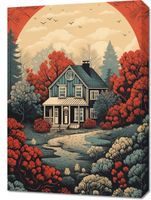 Obraz z serii wnętrza zatytułowany Idylla Rustykalna. Ten ciepły i urokliwy obraz przedstawia sielski dom otoczony przez bujny krajobraz w odcieniach czerwieni i pomarańczy, których intensywność podkreśla zachodzące słońce w tle. Kompozycja łączy w sobie elementy klasycznego amerykańskiego krajobrazu z nostalgicznym uczuciem, które przywodzi na myśl długie, leniwe popołudnia na wsi. Ilustracja ta idealnie nadaje się do nadania charakteru i ciepła każdemu wnętrzu, doskonale pasując do przestrzeni mieszkalnych, kawiarni lub pensjonatów, które chcą zaakcentować swoje powiązania z naturą i wiejskim spokojem.