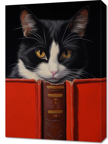 Obraz z serii wnętrza zatytułowany Koci Uczeń. Prezentuje on uroczego, czarno-białego kota z intensywnie żółtymi oczami, zaglądającego ciekawie do czerwonej, otwartej książki. Głęboki czarny tło podkreśla barwy i szczegółowe detale futra kota, a także złocenia na grzbiecie książki. Ten obraz łączy w sobie humor i ciepło, doskonale oddając osobowość i charakter kotów jako towarzyszy domowych. Idealny do umieszczenia w domowych bibliotekach, salonach czy pokojach dziecięcych, plakat ten dodaje wnętrzu przytulności i wprowadza zabawny, intelektualny element.