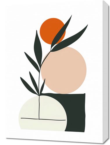 Obraz z serii boho zatytułowany Kompozycja Natury. Grafika łączy proste formy geometryczne z elementami przyrody, tworząc obraz, który jest jednocześnie nowoczesny i organiczny. Zestawienie gładkich, zaokrąglonych kształtów z ostrymi, ciemnymi liśćmi wprowadza wizualne napięcie, a pomarańczowa kula na wierzchołku gałązki przypomina zachodzące słońce lub soczysty owoc. Palecie barw dominują stonowane odcienie, które razem tworzą kojącą i zrelaksowaną atmosferę.Dzieło to doskonale sprawdzi się w przestrzeniach, które aspirują do stworzenia spokojnego i zbalansowanego wnętrza, takich jak jadalnie, poczekalnie lub pokoje relaksacyjne. Może także pełnić funkcję spajającą w pomieszczeniach z elementami zielonymi, takimi jak domowe ogrody zimowe czy salony w stylu eko.