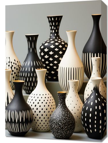 Obraz z serii wnętrza zatytułowany Kontrast i Harmonia. Eleganckie wazony w subtelnych odcieniach bieli i intensywnej czerni stoją dumnie na szarości tła. Geometryczne i abstrakcyjne wzory, które zdobią te wazony, przypominają tętniącą życiem tańczącą symfonię. Kropki, linie i formy tworzą intrygującą kompozycję, która przyciąga wzrok i dodaje wnętrzom wyjątkowej głębi. Subtelna gra świateł i cieni, a także kontrast między monochromatycznymi barwami, dodaje tej kolekcji odrobinę tajemniczości. Będzie to idealne dopełnienie zarówno dla nowoczesnych przestrzeni loftowych, jak i eleganckich salonów z naciskiem na design. Ten wyjątkowy plakat doskonale odnajdzie się w galeriach sztuki oraz w luksusowych hotelach.