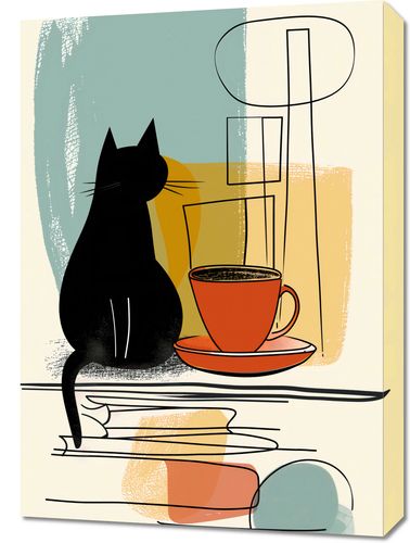 Obraz z serii abstrakcja zatytułowany Kot i Kawa. Ten pełen uroku obraz przedstawia sylwetkę czarnego kota, który wydaje się kontemplować filiżankę kawy. Stylizacja grafiki, z jej czystymi liniami i blokami kolorów w ciepłych odcieniach beżu, ochry oraz stonowanej zieleni i błękitu, tworzy atmosferę spokojnego poranka. Abstrakcyjne elementy w tle, przypominające sztukę modernistyczną, nadają plakatowi współczesnego charakteru. To dzieło sztuki idealnie pasuje do kawiarni, kuchni, a także jako subtelny akcent w nowoczesnym salonie, oferując wizualne wyrażenie komfortu i relaksu.