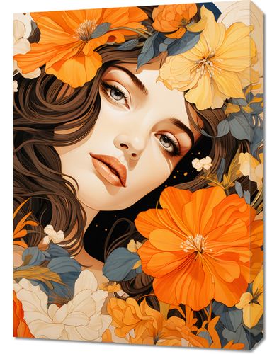 Obraz z serii natura zatytułowany Kwiatowa Esencja. Hipnotyzujące spojrzenie kobiety otoczonej eksplozją jaskrawych kwiatów podkreśla jej głęboką więź z przyrodą. Jej lśniące włosy splatają się z płatkami, a promieniejące oczu odzwierciedlają bogactwo i różnorodność przyrody. Płynące linie i bogate kolory sprawiają, że kompozycja jest niczym zjawiskowy ogród pełen życia i pasji. Wspaniale wpisuje się w wnętrza inspirowane motywami kiatowymi i kawiarniach