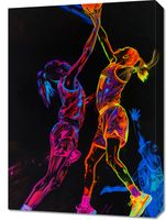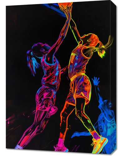 Obraz z serii abstrakcja zatytułowany Mecz W Kosza. Przedstawia żywą i dynamiczną scenę z gry w koszykówkę, w której dwie zawodniczki rywalizują o piłkę. Graczka w pierwszym planie wykonuje skok do kosza w akcie rzutu lub bloku, rozciągając się w pełnej koncentracji, podczas gdy jej przeciwniczka stara się ją zablokować. Figury sportowców są przedstawione w intensywnych, neonowych kolorach, które kontrastują z ciemnym tłem, co nadaje scenie energiczny i ekscytujący charakter. Kolory są rozmieszczone na postaciach w sposób, który podkreśla ich ruch i ekspresję, a także oddaje dynamikę i szybkość sportowej akcji. Obraz ten idealnie oddaje ducha sportowej rywalizacji i mogłby być inspirującym dodatkiem do wnętrza dla miłośników koszykówki i sportu.