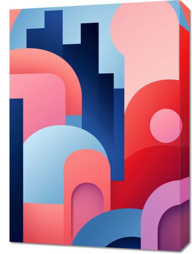 Obraz z serii geometria zatytułowany Miasto Kolorów. Złożone z różnorodnych kształtów i tonacji, przedstawiające wyimaginowane miasto pełne zakamarków i mostów. Błękitne wieżowce kontrastują z ciepłymi różami i czerwieniami, tworząc uczucie ruchu i dynamiki. Gładkie linie i łuki wprowadzają uczucie spokoju w środku urbanistycznego zgiełku. Doskonale odnajdzie się w nowoczesnych biurach oraz w przestrzeniach artystycznych galerii.