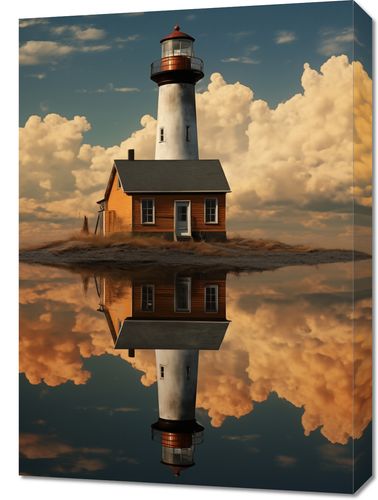 Obraz z serii pejzaże zatytułowany Morskie Odbicie przedstawia urzekający obraz latarni morskiej w ciepłych barwach zachodzącego słońca, odbijającej się w spokojnej tafli wody. Ta wysokiej jakości reprodukcja artystyczna przedstawia klasyczną, białą latarnię morską z czerwonym dachem, umieszczoną na małej wyspie z suchą trawą, która wydaje się dryfować wśród chmur dzięki idealnemu odbiciu w wodzie poniżej. Ciepłe, złote i pomarańczowe odcienie nieba w połączeniu z głębokim błękitem wody i białym korpusem latarni tworzą scenę pełną spokoju i majestatu. Obraz jest idealny dla miłośników morza, nawigacji, a także dla tych, którzy cenią sobie spokój i medytacyjny charakter natury. Doskonale nadaje się do zawieszenia w domowym salonie, biurze, przytulnej kawiarni, lub jako wyjątkowy akcent w pokoju o tematyce morskiej.