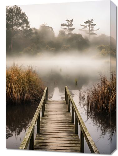 Obraz z serii pejzaże zatytułowany Most do Tajemnicy. Na tym mistycznym obrazie drewniana kładka prowadzi nas ku tajemniczej mgle, która delikatnie spowiła powierzchnię spokojnego stawu. Złote trzciny i zarysy drzew rzucają się w oczy na tle zamglonego poranka, tworząc uczucie ciepła i spokoju. Ten obraz oddaje piękno niewidzialnego świata, który czai się tuż za zasłoną mgły, zachęcając widza do refleksji i odkrywania nieznanego. Idealnie nadaje się do wnętrz, gdzie dominuje natura i spokój, takich jak salony spa, pokoje relaksacyjne, czy prywatne biblioteki. To wyjątkowy element dekoracyjny, który może przynieść element kontemplacji i odprężenia do każdego domu lub przestrzeni publicznej.