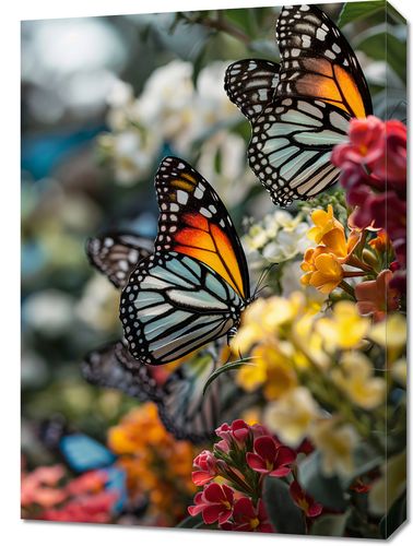 Obraz z serii natura zatytułowany Motyle Na Łące. Na obrazie widnieje trio monarchów, które z gracją spoczywają na kwitnących kwiatach, ich pomarańczowo-czarno-białe skrzydła wyłaniają się z tła pełnego barw i życia. Delikatne odcienie kwiatów w różnych odcieniach żółci, czerwieni i pomarańczy podkreślają naturalne piękno i delikatność motyli, a rozmyte tło nadaje kompozycji głębi i subtelności. Ten obraz jest celebracją życia i przemijania, idealnym do wnętrz, które pragną odzwierciedlić piękno i efemeryczność przyrody, jak salony, spa, czy pokoje wypoczynkowe.